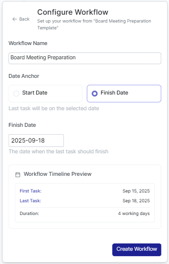 Preparing for a board meeting on 18 September? Set Finish Date to Sept 18, and WorkTiles will work backwards to make sure everything is done in time.
