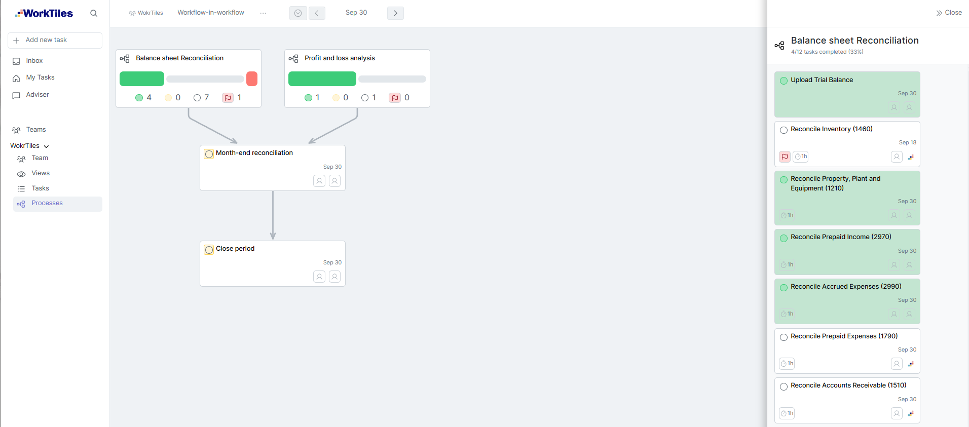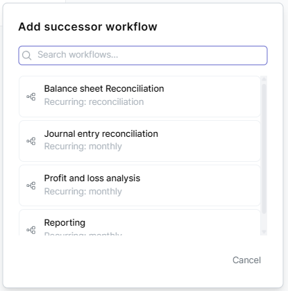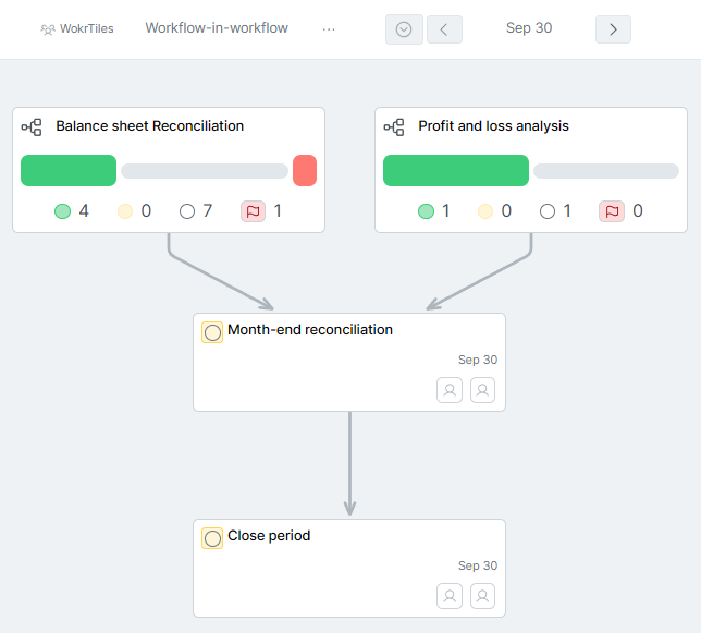 You can now link workflows together by adding workflow tiles directly into your workflow graphs. This creates clear dependencies between different financial processes, ensuring that teams know exactly when one workflow depends on another's completion.