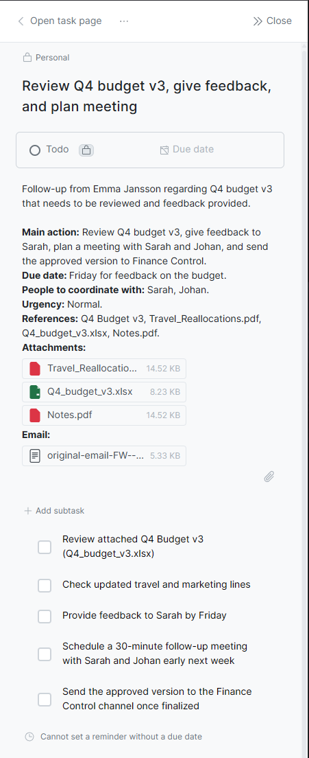 • AI understands times: Tell the AI "Create task for 3pm tomorrow"